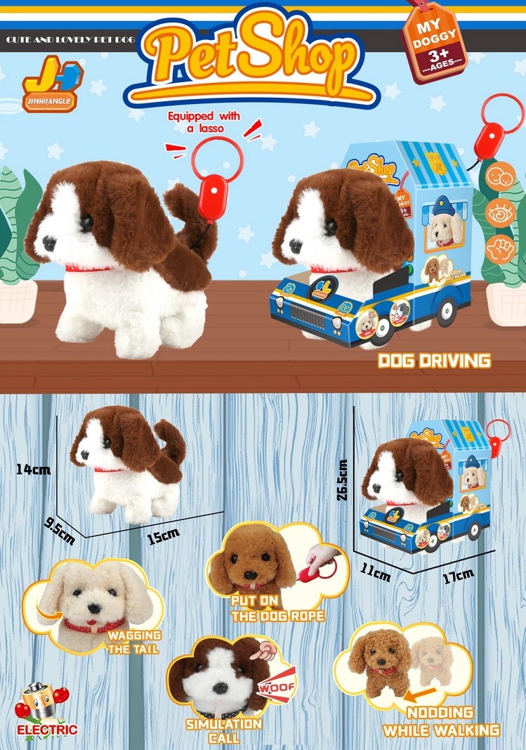 У питомца мягкая и красивая шерстка. Щенок ходит, гавкает, виляет хвостиком и поворачивает голову. Игрушка включается при нажатии на кнопку на поводке.