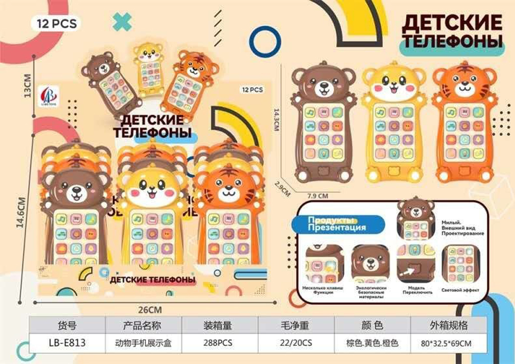 Телефон арт. LB-E813-805 Зверюшка цвета микс муз. на бат. (12 шт.) шоубокс
