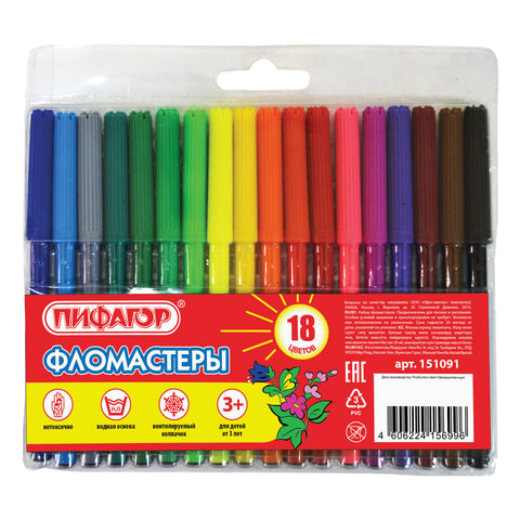 кс_Фломастеры ПИФАГОР, 18 цветов, вентилируемый колпачок, 151091