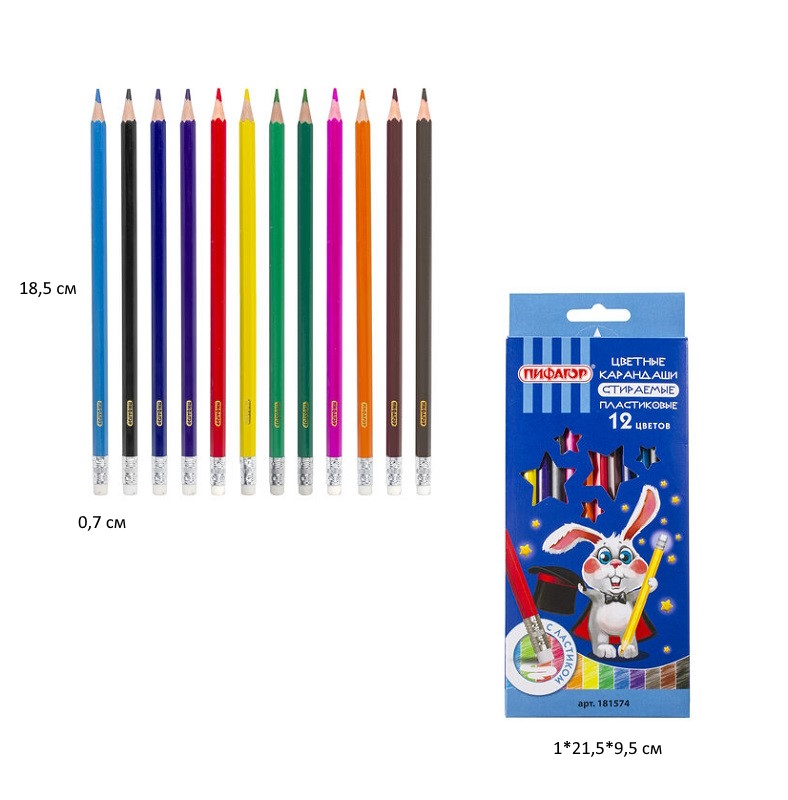 кс_Карандаши цветные арт. 181574 Стираемые с ластиком ПИФАГОР "МАГИЯ", 12 цветов, шестигранные