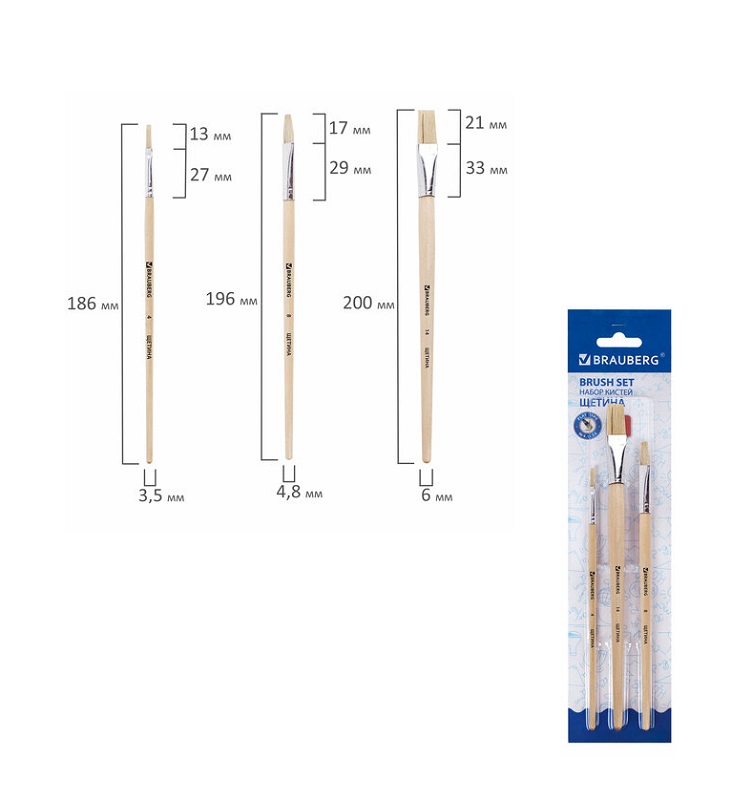 кс_Кисти арт. 200223 BRAUBERG, набор 3 шт. (щетина, плоские № 4, 8, 14), блистер