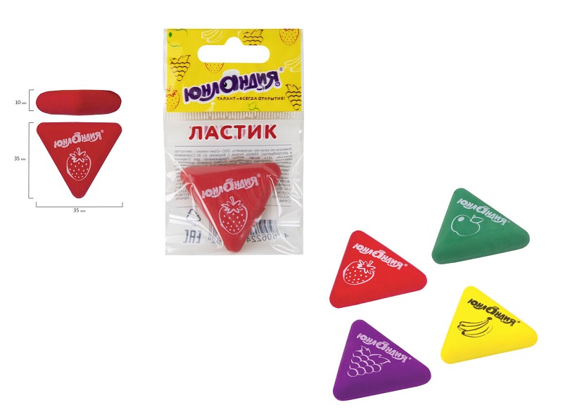 Ластик "Трио" предназначен для удаления надписей, сделанных чернографитным карандашом. Ластик имеет треугольную форму ярких цветов ассорти с печатью в виде фруктов. Он обеспечит лёгкое и чистое стирание без повреждения поверхности бумаги и без образования бумажной пыли.