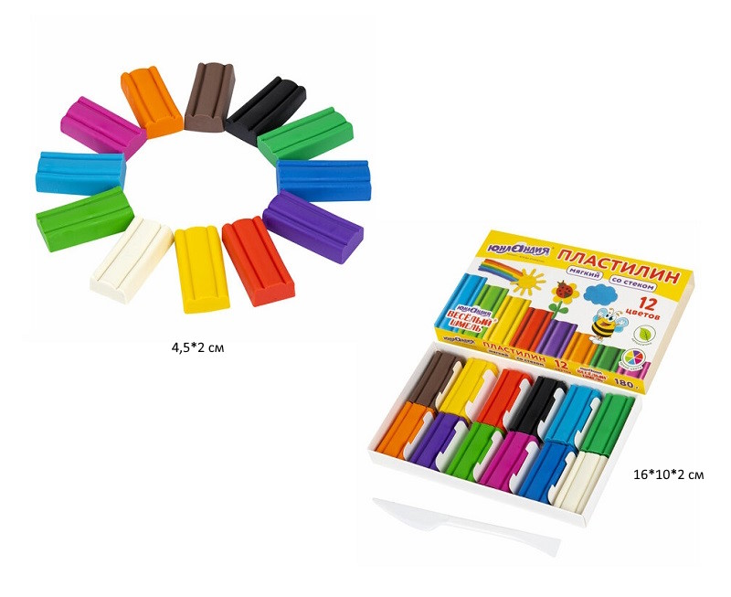 Пластилин мягкий арт. 106672 ЮНЛАНДИЯ "ВЕСЕЛЫЙ ШМЕЛЬ", 12 цветов, 180 г, СО СТЕКОМ