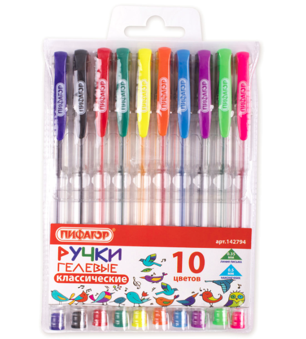 кс_Ручки гелевые ПИФАГОР, 142794 набор 10 шт. АССОРТИ, корп.прозрач.,узел 0,5 мм, лин.письма 0,35 мм
