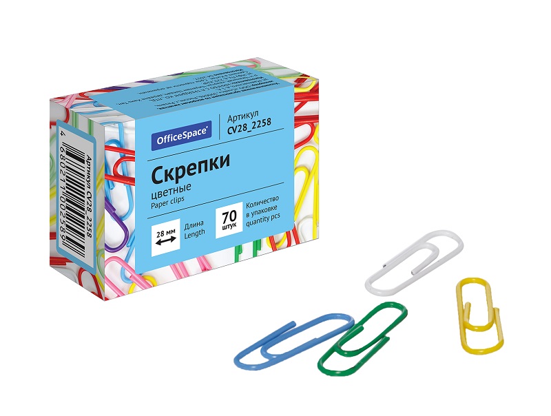 кв_Скрепки арт. CV28_2258 28мм, OfficeSpace, 70шт., цветные, карт. упаковка