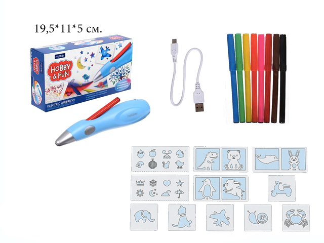 В набор входит: фломограф, 11 трафаретов, 8 фломастеров, USB кабель, инструкция.