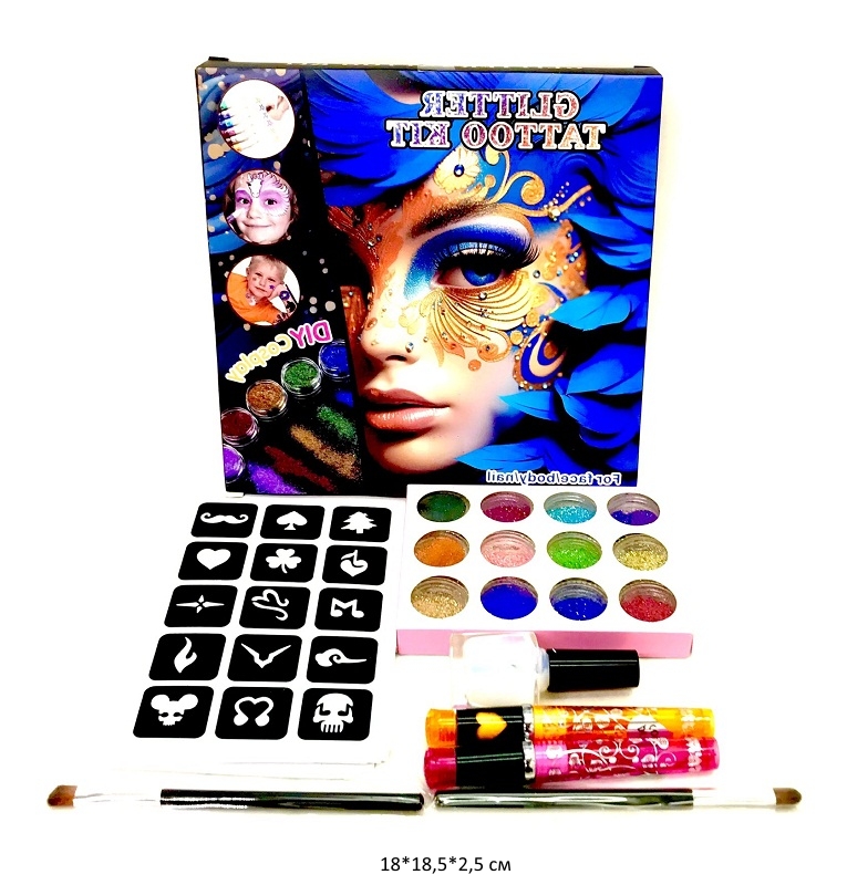 В наборе: трафареты 15 шт, блёстки 12 оттенков, клей 1 бутылек, ручи для блекс тату - 2 шт, набор кисточек для нанесения тату